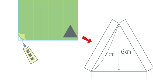 〈1〉で切りとった残った胴体部分4こを開いて、好きな色の紙※を全面に貼ります。頂点の高さが6cmの二等辺三角形をつくり、外辺に適当なのりしろをつくって切り取ります。