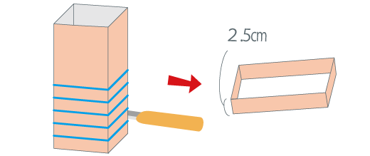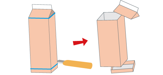 牛乳パックの屋根(やね)の部分(ぶぶん)と底(そこ)の部分を切(き)ります。同(おな)じものを8こ作(つく)ります。