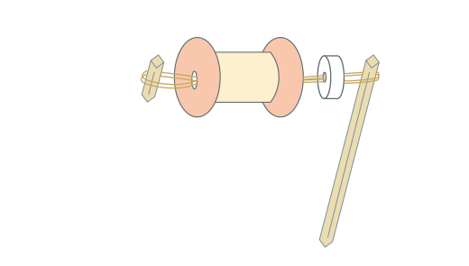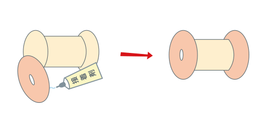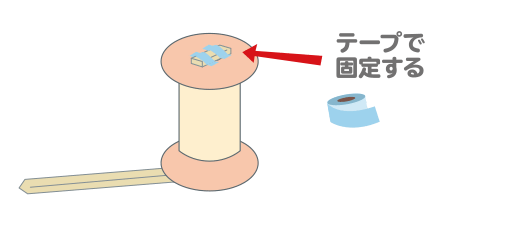 〈3〉で切(き)りぬいたものを、糸巻きの両はしに接着剤(せっちゃくざい)でつけていきます。