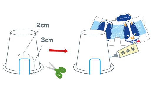 紙コップの口の部分を長さ3cm、幅2cmに切り取ります。ミクちゃんのテンプレートをダウンロードして、印刷をして切(き)りぬきます。 紙コップとミクちゃんのテンプレートを接着剤(せっちゃくざい)でつけます。