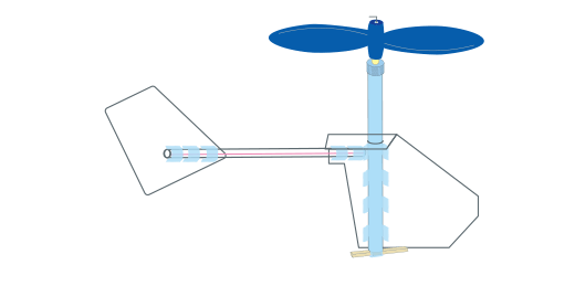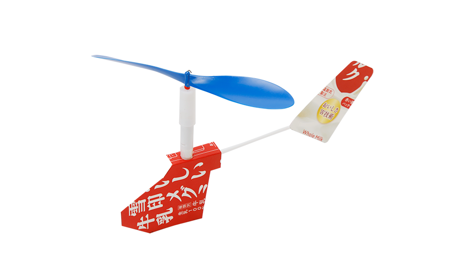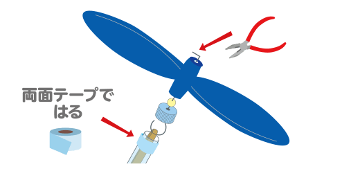 ローター部分をつけ、さらにストローを胴体(どうたい)と尾翼(びよく)に固定し、それぞれをセロハンテープで固定します。
