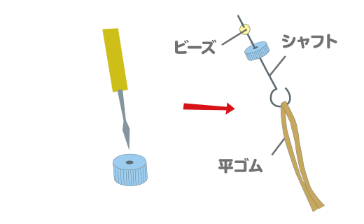キャップの中央にキリで穴(あな)をあけます。さらに、シャフトにキャップとビーズを通し、平ゴムをかけておきます。※ キャップは、工作用(こうさくよう)のりや調味料(ちょうみりょう)入れなどのキャップで、太いストローに合うものを見つけましょう。