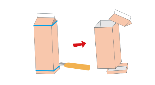 牛乳パックの屋根(やね)の部分(ぶぶん)と底(そこ)の部分を切(き)ります。