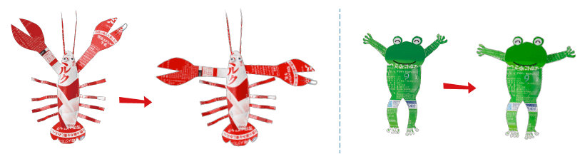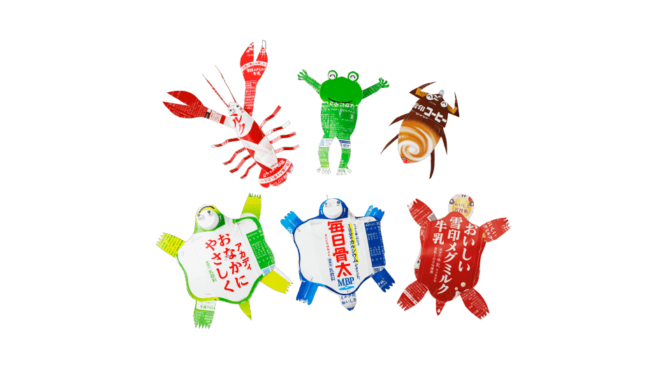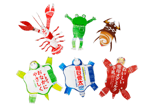 いろんな種類(しゅるい)の紙パックを使うと、カラフルな生きものたちができます。