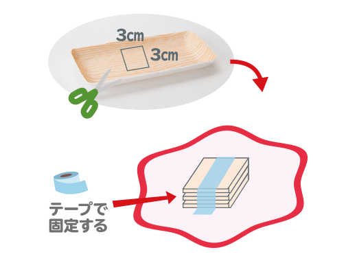 生きものの大きさに合わせた食品のトレイを、1の部分に、3段(だん)ほどかさねて、セロハンテープでとめます。