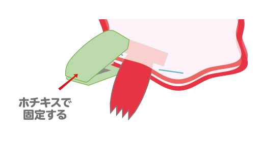 頭や口の部分などに、ゼムクリップをホチキスでとめて、つりの引っかけ用に取りつけると完成です。