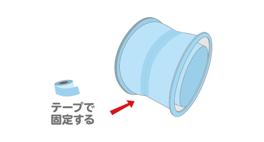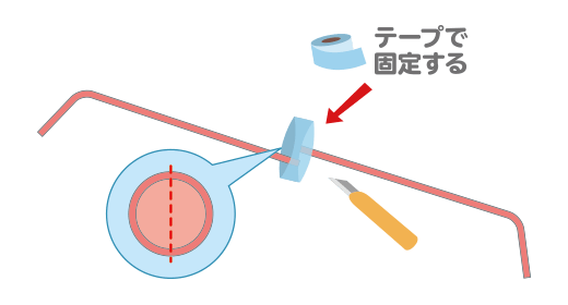 ストローを2本用意して、ストローの断面(だんめん)に2本ともカッターで切(き)り込(こ)みを入れます。ストローどうしを差し込んでその上をテープでとめます。