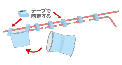3と3個目のカップをテープでとめて、先ほど切ったストローをテープでとめます。