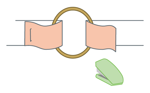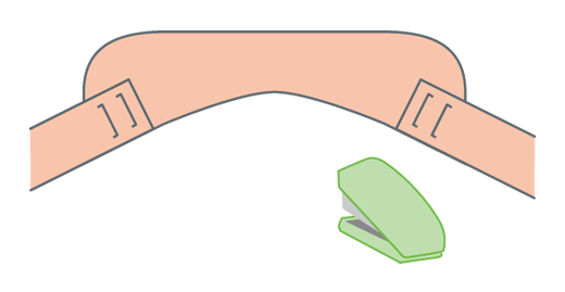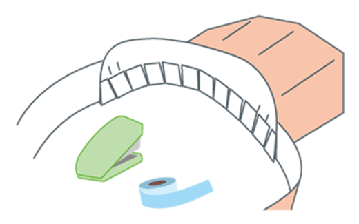 輪ゴム(わゴム)をかけて、頭の大きさに合わせて、ホチキスでとめます。