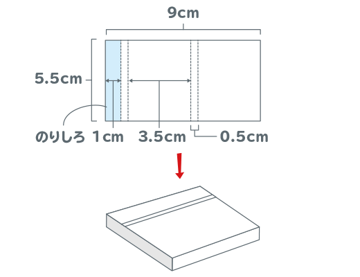 図のサイズに切り取り、点線(てんせん)で折って平たい筒(つつ)をつくります。