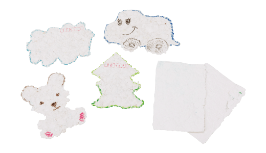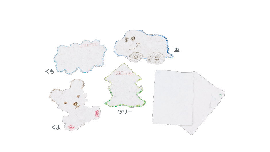 手すきはがきの完成。模様(もよう)や色(いろ)をつけると、オリジナルのハガキが作れます。