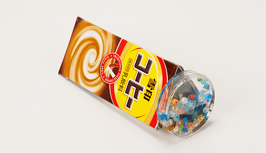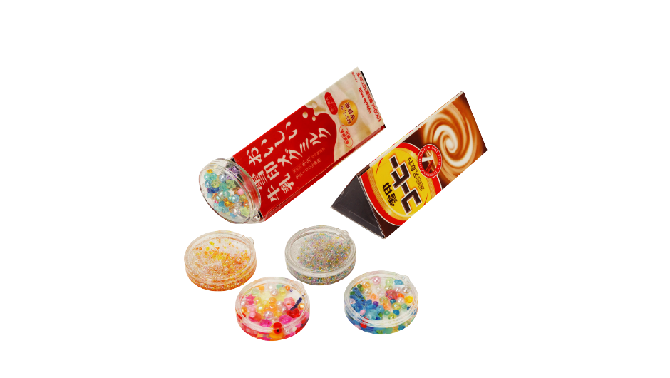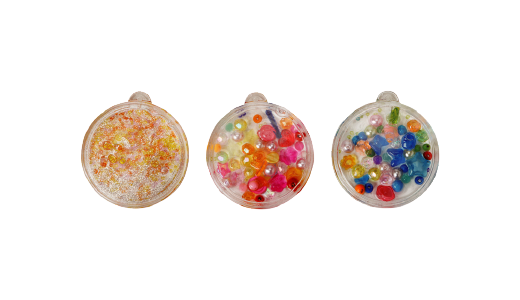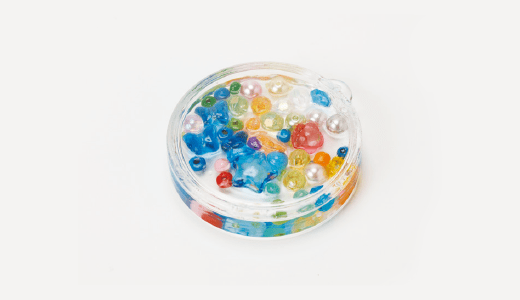透明(とうめい)のプラスチック丸型ケースに、好きなビーズなどを入れ、最後にベビーオイルを入れて、フタをして密閉(みっぺい)します。