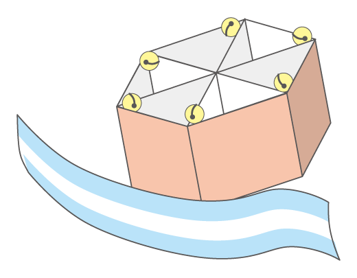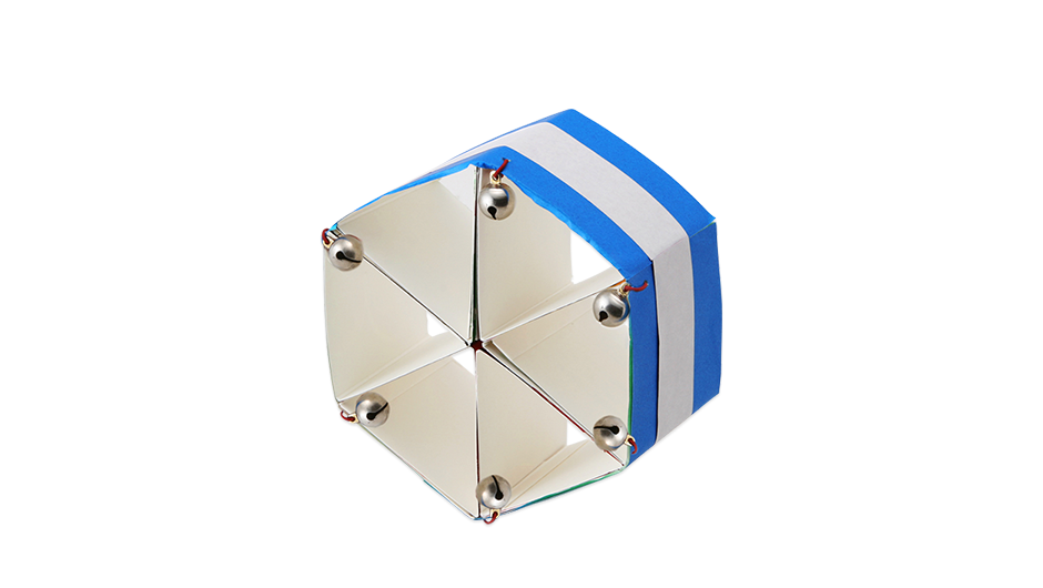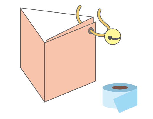 図のように三角柱(さんかくちゅう)になるようにおり重ね、両面テープで固定(こてい)します。角に穴(あな)をあけ、すずのヒモを通してむすびつけます。全部で6こ作ります。