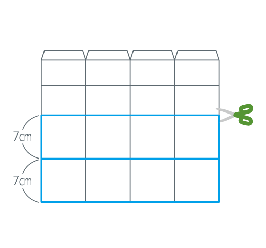 牛乳パックの胴体(どうたい)部分を7cmの幅でふたつ切り取ります。全部で6こ作ります。