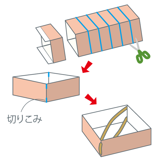 牛乳パックの胴体(どうたい)部分を2?3cmくらいの幅で輪(わ)切りにします。図の部分に切りこみを入れ、輪ゴムをかけます。これをたくさん作ります。