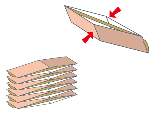 輪(わ)ゴムがバネになるようにおさえながらたたみ、たくさん重ねてハコの中にそっとつめてフタをします。