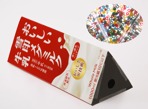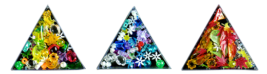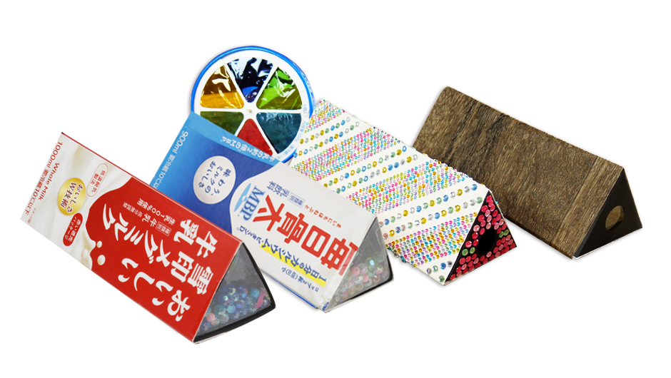 上にビーズや小さく切った色紙(いろがみ)などを入れ、カードケースを一辺が6.7cmの正三角形に切り取ったフタをかぶせセロテープで固定(こてい)します。