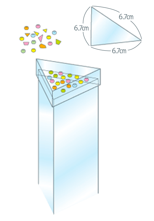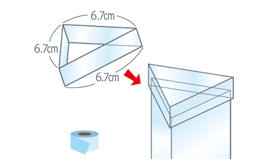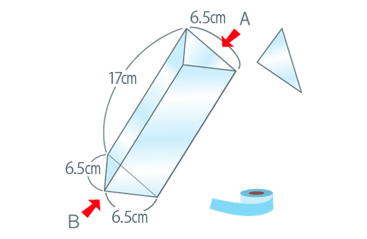 硬質(こうしつ)カードケースをカッターで切り取ってセロテープでとめ、正三角形の一辺が6.5cm、高さが17cmの三角柱(さんかくちゅう)の筒(つつ)を作ります。Aの面はカードケースを一辺が6.5cmの正三角形に切り取ってフタをします。