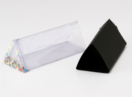 三角柱(さんかくちゅう)の側面(そくめん)を黒い紙でおおい、セロテープでとめます。