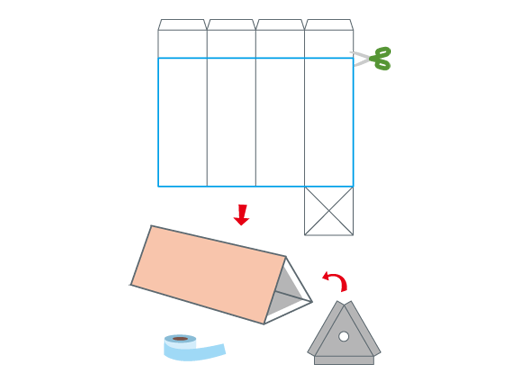 図のように牛乳パックを切り、4の側面(そくめん)に折りこんでかぶせ、セロテープで固定(こてい)します。まんなかにのぞき穴(あな)をあけた黒い紙でB面側にフタをします。