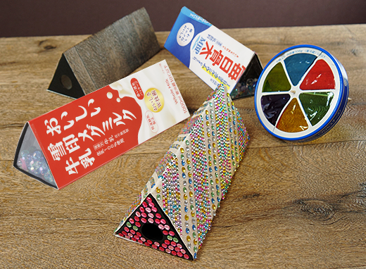 穴(あな)からのぞくと、こんなふうにきれいに見えます。外側(そとがわ)にきれいな色紙(いろがみ)をはってみよう。