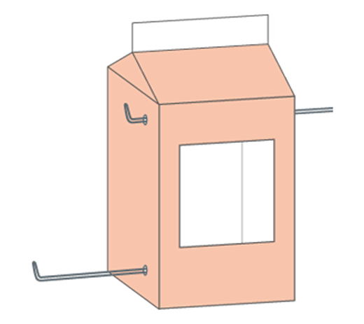 牛乳パックの上部から3の紙を入れ、下のはじを下のはりがねにはさんでセロテープでしっかりととめ、もういっぽうも上のはりがねに同じようにとめます。