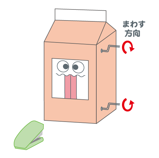 牛乳パックの屋根(やね)をホチキスでとめます。
