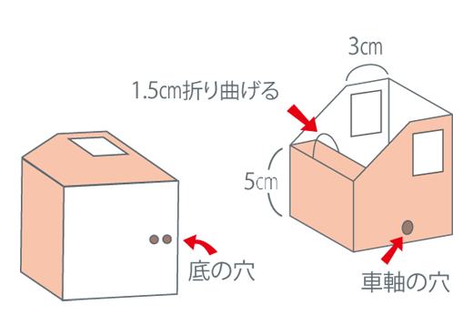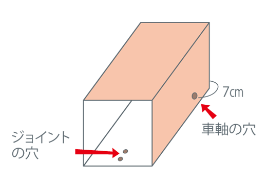 両側(りょうがわ)に、車軸(しゃじく)の穴(あな)をあけます。底(そこ)にはジョイントの穴を2つあけます。 -