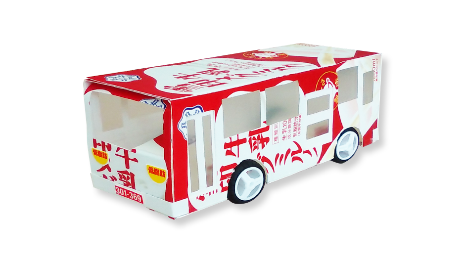 ※行き先表示版は、パッケージの社名などを使うと、それらしく見えるよ。リアは、窓の内側(うちがわ)からはります。ナンバープレートは、バーコードの数字を切り取って使います。(いろいろ工夫(くふう)してみよう。) -