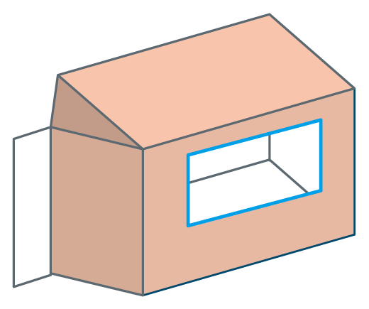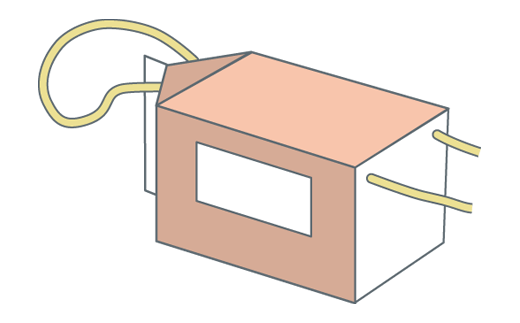 牛乳パックの胴体(どうたい)を切りぬいて、窓(まど)をあけます。反対側(はんたいがわ)にも同じように窓をあけます。