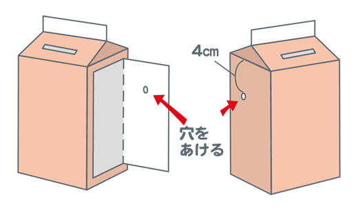 図のように上から4cmのところに、竹ぐしを通す穴をあけます。反対側(はんたいがわ)にも、同じように穴をあけて、図のように切り開き、扉(とびら)を作ります。
