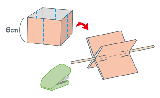 残りの牛乳パックを6cmに切り、真ん中にカッターの背で、折りスジをつけます。真ん中に12cmに切った竹ぐしを入れ、折りスジを中心に折り込んで、ホッチキスで固定(こてい)します。 -