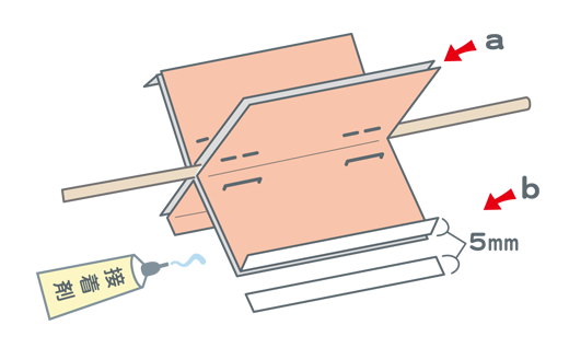 〈b〉のように、一方は5mmのところで折り返します。もう一方は、5mmのところで切りはなします。接着剤(せっちゃくざい)ではります。 -