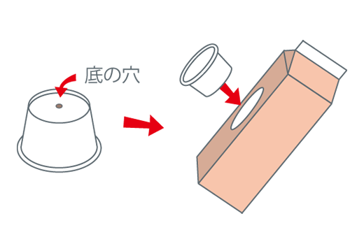 デザートカップの底(そこ)に千枚(せんまい)どおしで穴をあけます。<1>の牛乳パックに、はめ込みます。同じものを2つ作ります。