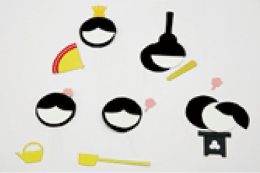 〈1〉で切り取ったお道具(どうぐ)を、はり付けます。