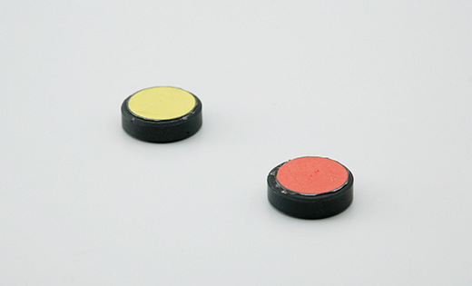 磁石(じしゃく)は、すべてが反発(はんぱつ)する向きに、上下をそろえます。〈2〉で切り取った、赤と黄色の円を、3こずつはり付けます。