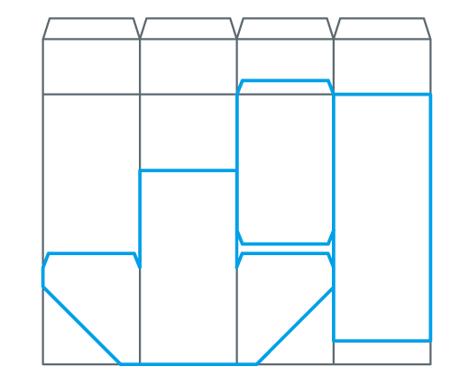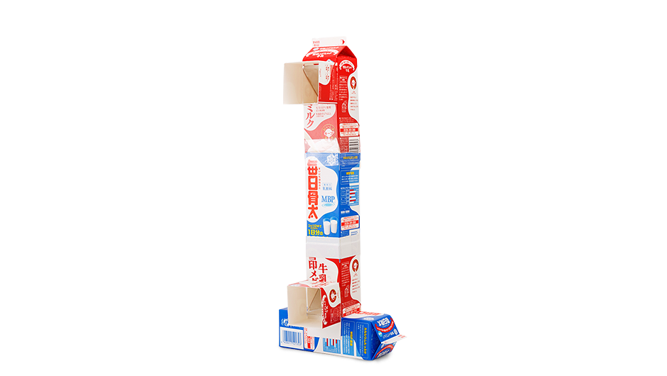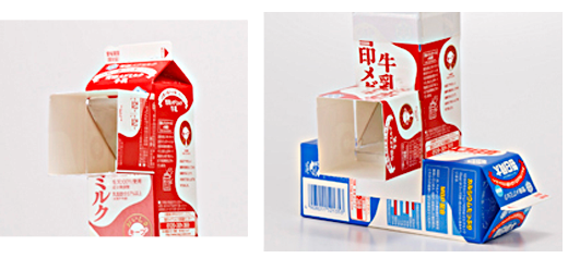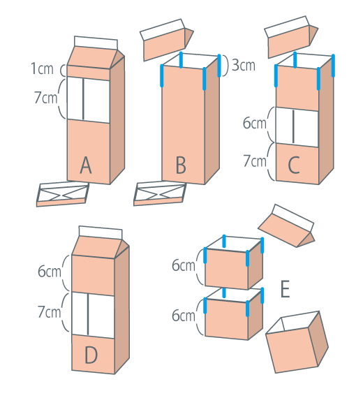〈B〉は、屋根(やね)と底を切り取り、上から3cmのところまで、切り込みを入れます。