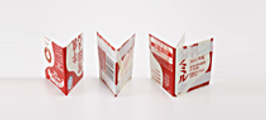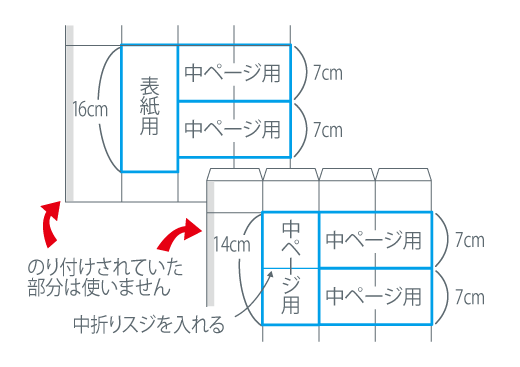 図のように、牛乳パック2こを開き、表紙(ひょうし)用を1枚、中ページ用を5枚切り取ります。