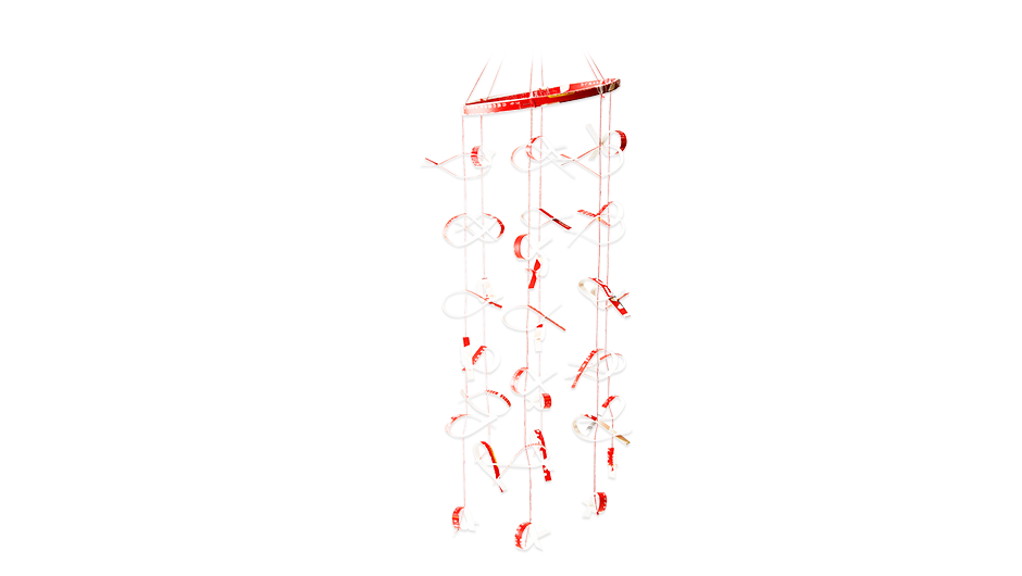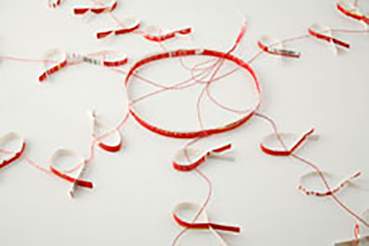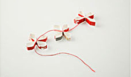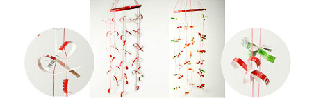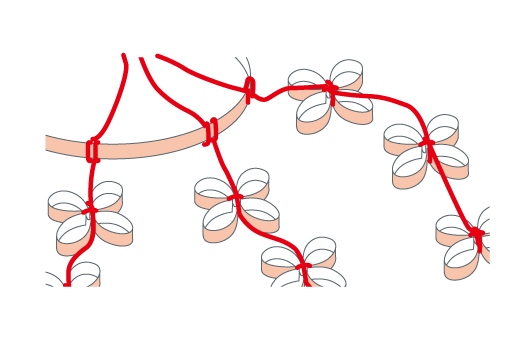 〈4〉に〈3〉を、等間隔(とうかんかく)に結びます。 つるすための糸を、6本結びつけます。輪の上で、まとめて1つに結びます。