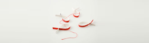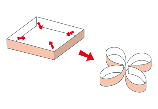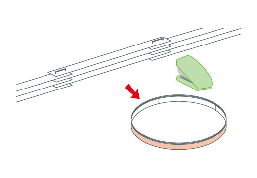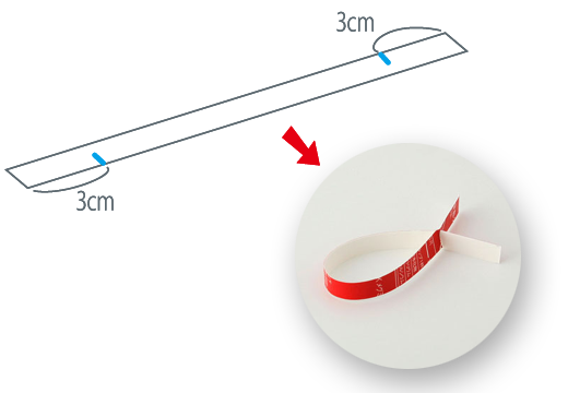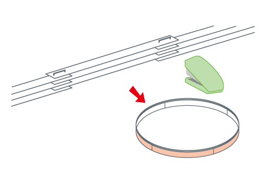 端(はし)から3cmのところに、図のように切り込みを入れます。丸めて、両端の切り込みを合わせ、差し込みます。