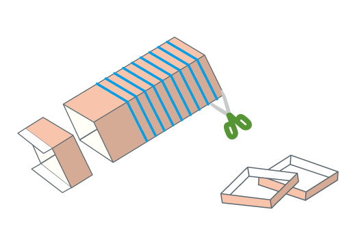 牛乳パック2こを開いて、図のように幅(はば)1cmの短冊(たんざく)を、48本切り取ります。