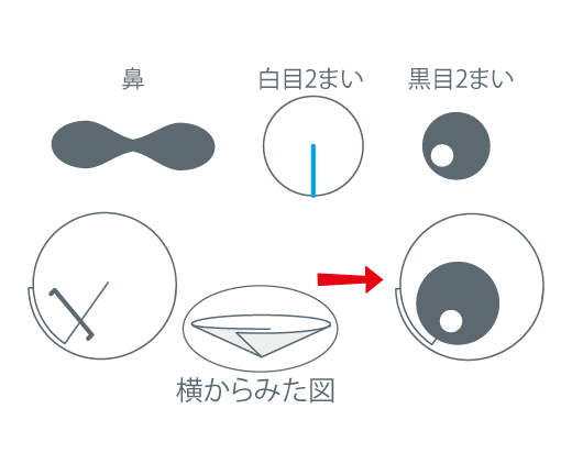 白目は図のように、切りこみの部分を丸めるようにして重ね、ホチキスでとめます。黒目は、ホチキスの針が見えないようにはり付けます。