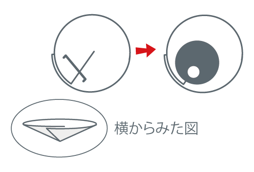 白目は、図のように切りこみの部分を丸めるようにして重ね、ホチキスでとめます。黒目は、ホチキスの針が見えないようにはり付けます。