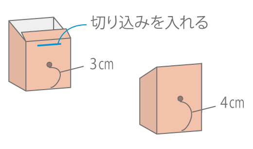 〈b〉は、のりしろのある面(めん)の、下から3cmのところに、穴を開けます。のりしろの下5mmのところに、4cmの切り込みを入れます。