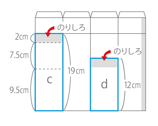 図のように、〈c〉の下に〈d〉を2cm重ね(かさね)て、接着剤(せっちゃくざい)ではり付けます。さらに、ホチキスでとめます。
