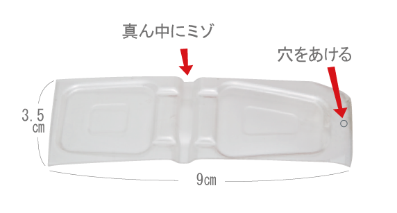 ペットボトルは、写真(しゃしん)を参考(さんこう)に、長さ9cm、幅(はば)3.5cmに切り、たこ糸を結び(むすび)つける穴を開けます。