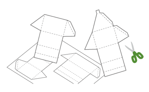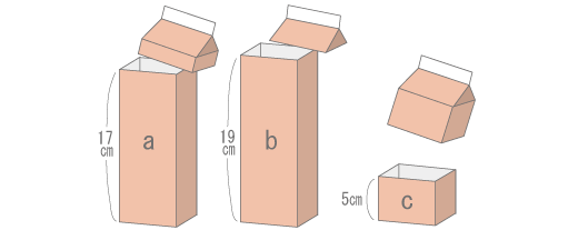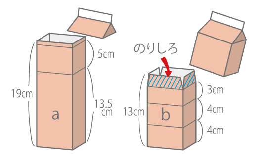 牛乳パックは、17cmのものを4こ、19cmに切ったものを8こ、5cmのものを4こ、用意(ようい)します。