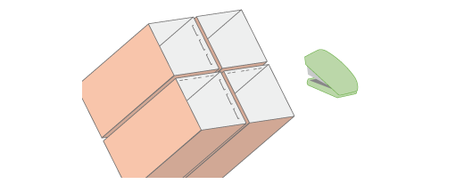 同じ長さの4こをたばね、接着剤でとめて、さらに、ホチキスでとめます。