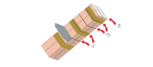 印にあわせ、屋根〈イ〉〈ウ〉〈エ〉をはり付け、それぞれをつなぎ合わせます。 -