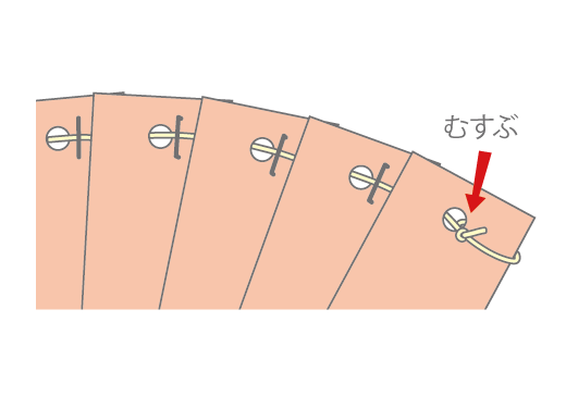 一番下の1枚の穴に、たこ糸を通して、結びます。